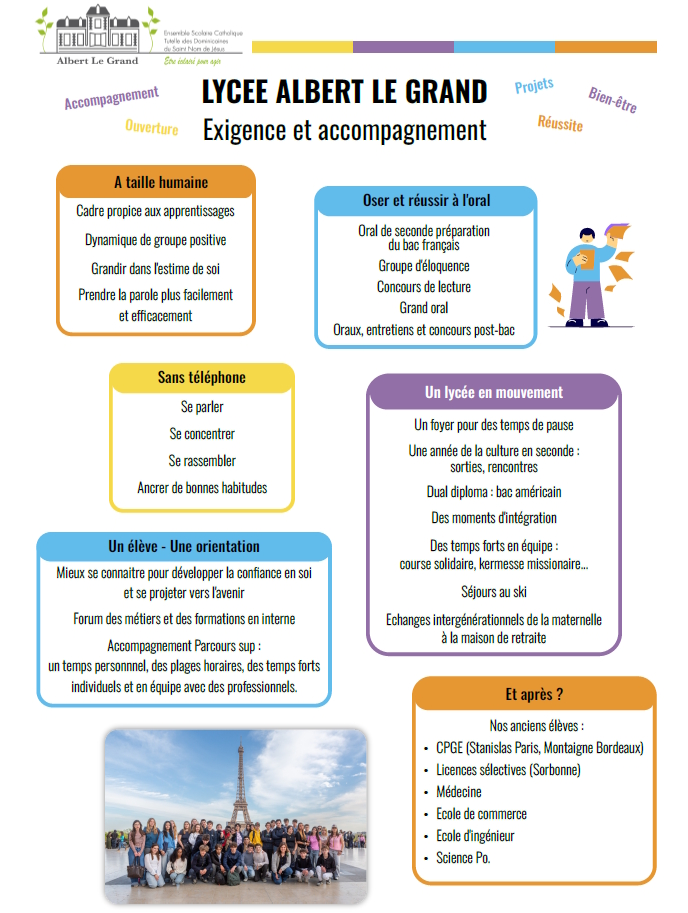 Albert Le Grand, c’est une école, un collège, un lycée et un internat (filles et garçons). Au fil des pages, vous découvrirez ce qui fait la spécificité de cet établissement catholique sous tutelle dominicaine du Saint Nom de Jésus.